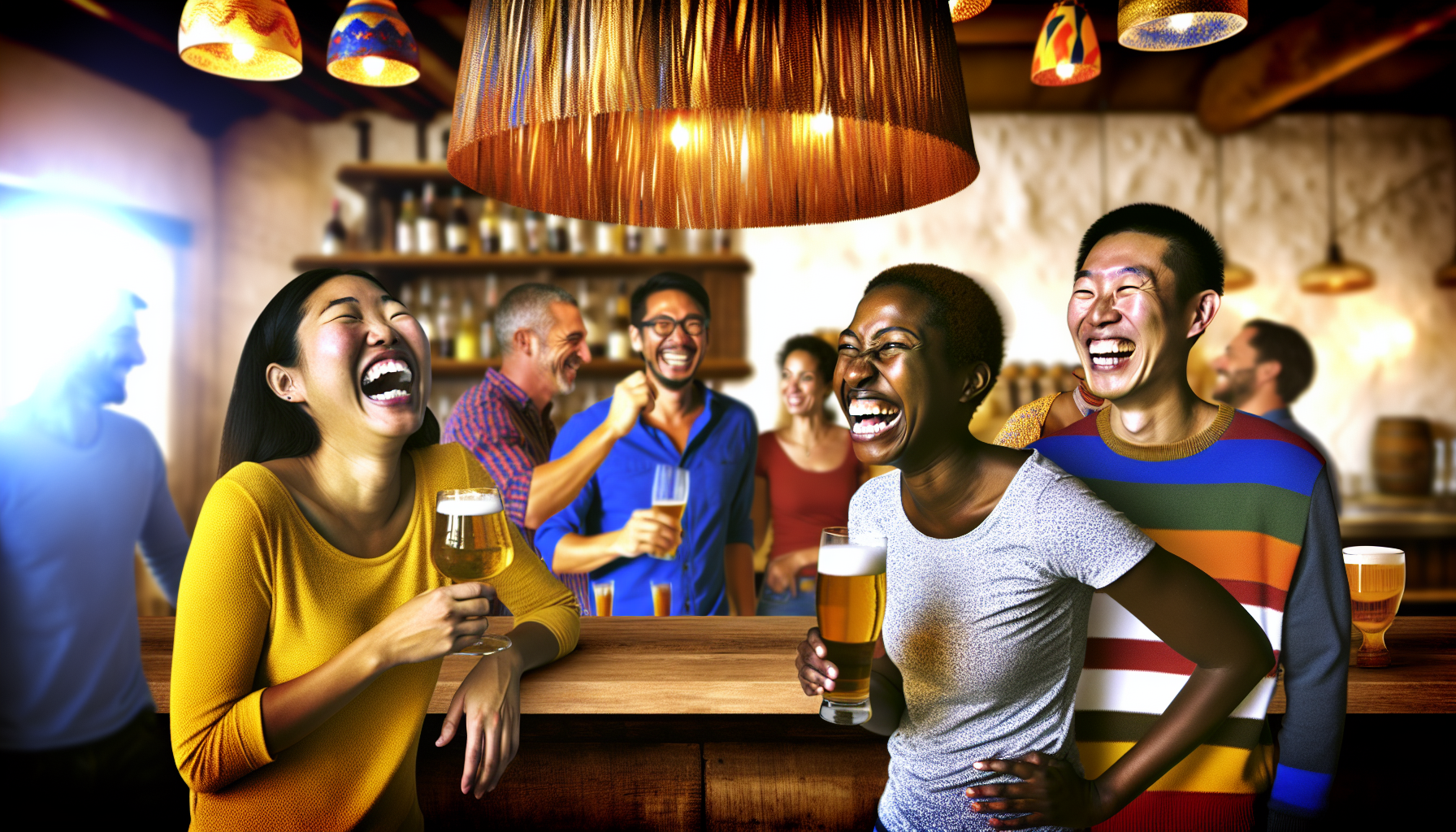 Eine abstrakte Darstellung einer regulären Szene, die Lachen in einer traditionellen Bar hervorruft. Stellen Sie sich eine Gruppe von Menschen vor, die unbeschwerte Momente teilen. Unter der Menge gibt es einen asiatischen Mann, der herzlich lacht, während er ein Glas Bier hält, eine afrikanische Frau, die breit lächelt und ihren Arm mit einem weißen männlichen Freund verknüpft hat, und eine weibliche Barkeeperin aus dem Nahen Osten, die lächelnd Getränke zubereitet. Die Menschen sind lässig in lebhaften Farben gekleidet. Warmes Licht von einem hängenden rustikalen Kronleuchter lässt den Raum gemütlich und einladend wirken. Denken Sie daran, es zu einer humorvollen Szene zu machen, die das Wesen von Freundschaft und Lachen einfängt.